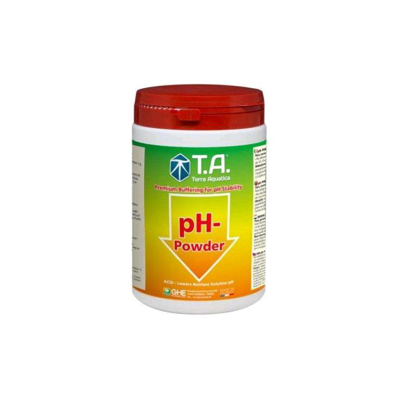 | GHE Terra Aquatica pH Down w postaci proszku wykorzystuje kwasy azotowy w formie wolno przyswajalnej, kwas fosforowy do obniżenia poziomu pH w wodzie. Regulator można stosować w każdej fazie wzrostu rośliny. Dzięki swoim szczególnym cechom, organiczny kwas cytrynowy przejmuje buforowanie zmian pH w czasie, utrzymując stabilny roztwór składników odżywczych i pomagając radzić sobie z nadmiarem wapnia w obszarach twardej wody. PH down można stosować również do czyszczenia i dezynfekowania systemów hydroponicznych oraz nawadniających. Dawkowanie: