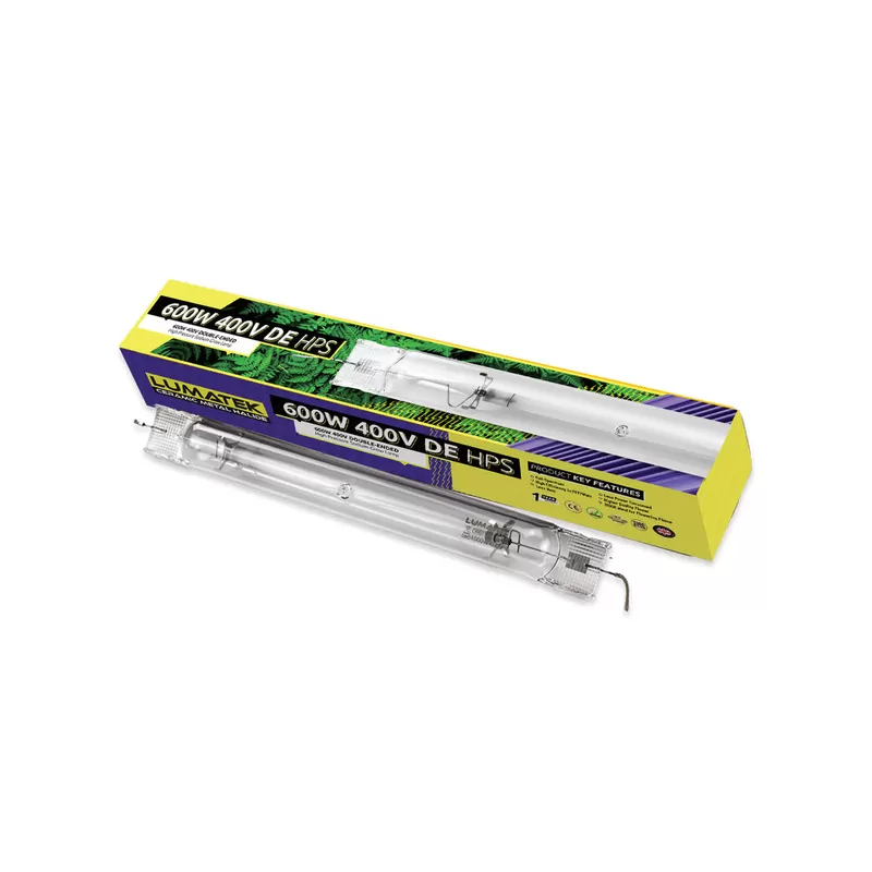 Lumatek 600W 400V DE to wysokowydajna, dwustronnie podłączana (Double Ended – DE) lampa sodowa HPS (High Pressure Sodium), zaprojektowana specjalnie do uprawy roślin w profesjonalnych uprawach wewnętrznych. Wykorzystując technologię 400V, lampa zapewnia wyższą efektywność świetlną, lepszą stabilność spektralną i dłuższą żywotność w porównaniu do tradycyjnych lamp 230V.